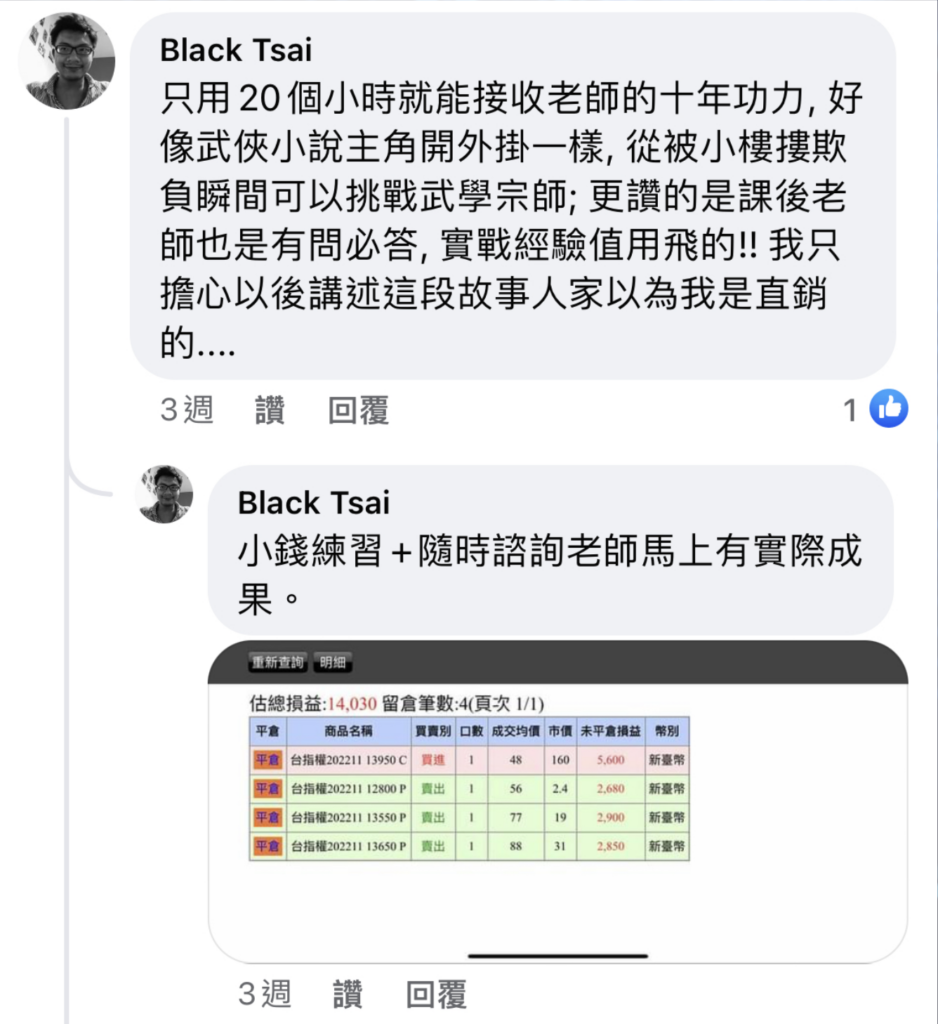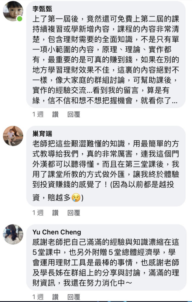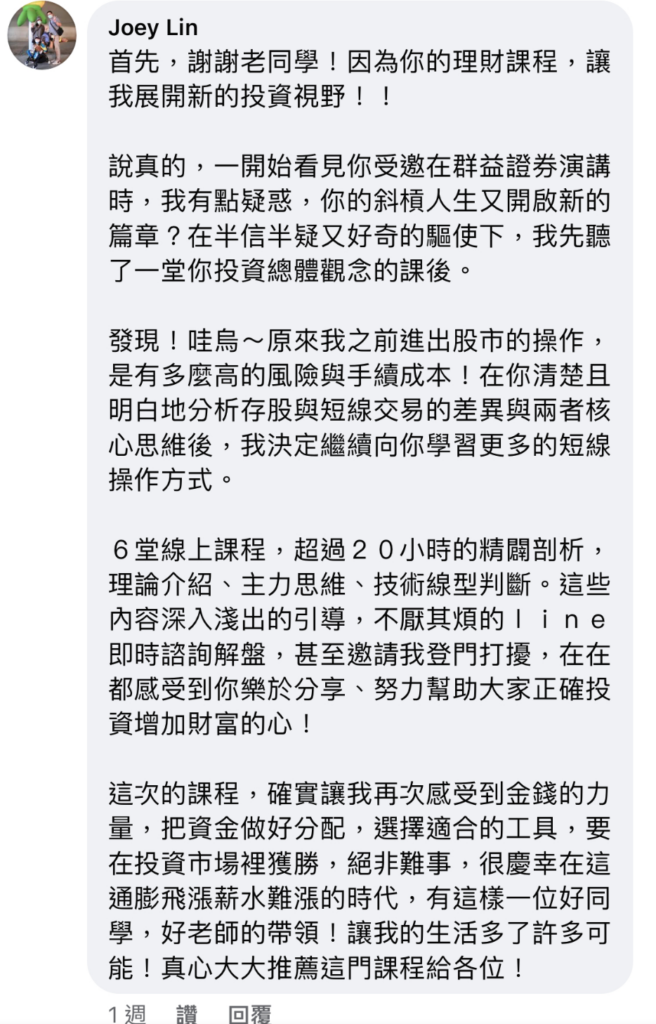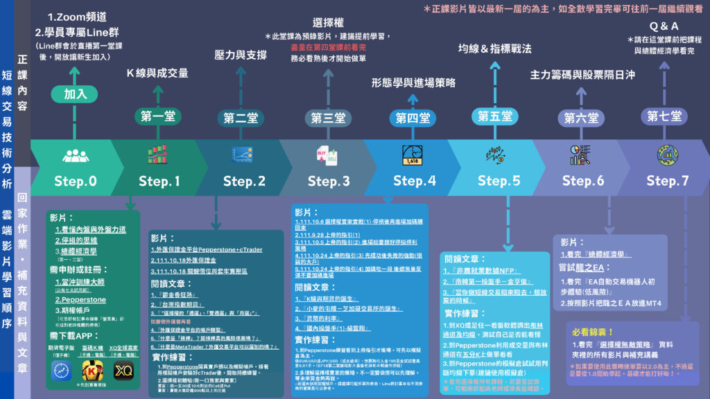 短線交易技術分析訓練營 您報名此課程,能得到以下內容:1.二十四小時以上的直播課程影片2.再送『六堂總體經濟學課程影片』+『基礎全面投資概念課』3.可無限次複習+更新課程內容4.免費參與老師與助教的個別教學,教到你會為止5.大Line群與同學和學長姊交流,不再孤獨做單 我要報名! *必須要參與此門短線交易技術分析,才能報名最終階段課:『外匯自動交易機器人』、『頂尖選擇權:絕對無敵策略』*本課程一年固定僅辦理兩梯,分別是1月底的寒假與7月初的暑假*若有經濟困境或是股票慘賠100萬以上急需老師救援的,請私訊老師亦可來信:jonnytiger01@gmail.com 主要運用戰場:期貨當沖、任何K線商品判斷是否停利停損只看K線變化,勝率非常低,一定要以成交量變化的意涵輔助判斷,任何一個技術分析都需成交量輔助,因為那是大戶進出場的指標。1.基礎K線與群組K線2.K線型態形成的原理3.成交量的識別-價與量的連鎖關係4.K線與成交量的搭配分析-大戶進出場的力道方向5.停損概念與人性弱點6.期貨當沖要領與台股盤型6大常態 主要運用戰場:每個投資物的賭轉折方向,以及停利、停損時機,壓力支撐線看似很多,但其實要經過驗證,以及主力作價痕跡輔助。1.箱型理論與壓力支撐2.主力成本與壓力支撐3.壓力支撐互轉的條件與重要性4.有效的壓力支撐位置判讀法5.主力在壓力支撐線的作盤習性6.趨勢盤與盤整盤的觀察與策略7.外匯保證金原理與操作 買家賭事件轉折,賣家靠時間吸錢選擇權可以控制風險與獲利,玩低風險賣家策略輕鬆9成勝率1.為什麼投資策略一定要學選擇權2.選擇權買家與賣家的優劣勢3.選擇權買家的策略-趨勢發生時,低風險賺翻倍4.選擇權賣家的策略-盤整不動時,每天當吸血鬼5.選擇權實際作盤的詳細教學6.搭配總體經濟學的不看盤策略*Bonus:透過老師推薦,開期權戶直接跟講師一樣低的手續費! 主要運用戰場:除了虛擬貨幣之外的都可形態學利用經驗幫助你判斷未來可能行情,在最高勝率進場1.斐波納契波浪理論2.常見K線型態與進場停損設置3.勝率最高的做單法-上帝的指引 + 成交量4.上帝的指引形成原理與角度、時間因素之勝率分析5.強勁K線與進場停損設置6.綜合策略勝率分析 主要運用戰場:台指期貨、外匯保證金均線在趨勢盤與盤整盤各有相應策略,可以提供另一種進出場判斷1.盤整盤的武器-選擇權與均線戰法2.布林通道在各種盤型的運用3.均線由來與短線交易上的重要意義4.均線戰法在台指期的運用5.均線戰法在外匯保證金的運用6.輔助指標判讀-KD、MACD、RSI 研究法人與操盤手的習性,永遠都是提高勝率的不二法門全世界大戶的作價手法都那幾招重複而已,換成你操盤也是一樣的1.大戶操盤手操作股票的策略與應對之道2.重要APP輔助系統操練3.股票隔日沖的重要策略4.三大法人的期權籌碼分析5.外匯市場的籌碼分析6.操盤手與台指期經典6大盤型7.綜合討論 買一門再送三門! 贈1:全面投資基礎概念課 這門課告訴你,賺錢的路有哪些,又有哪些難關要克服帶你認識目前台灣市面上四大投資工具(期貨、選擇權、外匯、黃金等CFD),並建立使用槓桿投資工具的基礎觀念,新手短線交易的第一步將都在這堂課學習。 贈2:全台唯一的-總體經濟學 總體經濟學影響世界股票、外匯等行情至關重要你不懂總經,就等於在股市都用猜的,搞不清楚為何會漲跌要明白總經方向,才能準確推斷投資物的漲跌是真還是假1.總體經濟學的關鍵公式-貨幣利率=通膨 X 經濟熱度2.貨幣利率的由來與影響股市方向的原因3.美國FED的政策與歷史4.通膨指標、意涵,影響股匯市的程度5.經濟熱度指標、意涵,影響股匯市的程度6.綜合討論(此課程共有5堂,為全台唯一有系統教學總體經濟學的課程) 贈3:外匯交易機器人(含操作教學) 外匯手操太累了,躺著賺比較輕鬆-交給自動交易機器人!1.訓練班結束會贈送一支法人研發的EA機器人-Dragon2.指導如何在MT4使用自動交易EA機器人3.你自己手操,都沒有完全交給Dragon來的高勝率4.體驗過輕鬆獲利後,再決定是否攻到最高級的機器人課5.就算不參加最後階段機器人課,Dragon也能帶你體驗財富自由 聽聽學長姐們的課程反饋 短線交易絕對是高難度的關卡,如果有老師告訴你有簡單又輕鬆的投資策略,那一定是想騙你學費連法人大戶操盤手都會在短線交易中賠錢,怎麼可能有人告訴你有很簡單的方式呢?你在這條路上會歷經以下這個歷程小賺大賠 -> 學習 -> 建立信心-> 不信邪凹單而大賠 -> 想放棄-> 打起精神再學習 -> 謹慎下單,控制風險-> 改變人性 -> 開始大賺小賠 -> 穩定獲利這條路上若能克服,等於身邊隨時有一台提款機可以讓你無限提款這絕對不是容易的事情,但值得你給自己一個機會嚐試 若試過之後感覺永遠都學不會,做外匯小賠受傷後,就離場畢業回家,專心工作存股到退休若一點一點進步,那你該留在場內,找到一個最適合自己的交易策略,反覆做到退休,再也不用擔心老闆裁員如果看到這,你就打算放棄的話,就還太早囉!因為老師的選擇權策略會很輕鬆打造9成以上投資勝率只是獲益率約"1個月3-5%"至少幾乎不賠錢,就當作高息存款而且本門課結尾會送你一支超強自動交易機器人它是法人所研發出專門坑殺散戶的武器老師會在課程末尾教你怎麼怎麼用此機器人體驗什麼叫做躺著就有錢跑進口袋的感覺到時候,你再決定自己是否放棄,還是要繼續感受短線