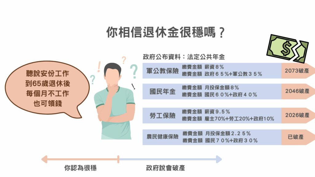 因此你還要寄託好幾10年後才用想像的退休金嗎?你能保證政府不再年改來大砍退休金嗎?真正聰明的你,從現在就開始學習理財投資,改變自己的思維,靠著工作賺錢加上穩定理財投資錢滾錢,打造出提前退休的未來吧!