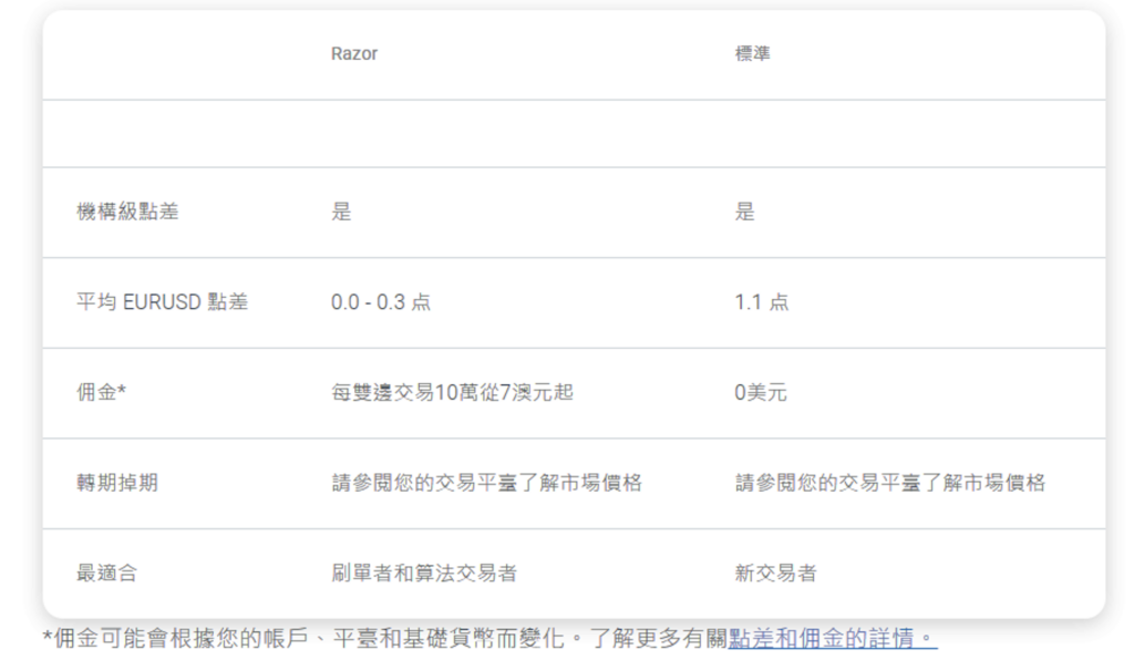 以Pepperstone為例,當我們初次註冊的時候,就會要我們選擇是要哪種帳戶類型,有兩種可以選:「剃刀」(Razor)和「標準」(Standarf)。若我們打開官方網頁的說明,會找到以下圖示: